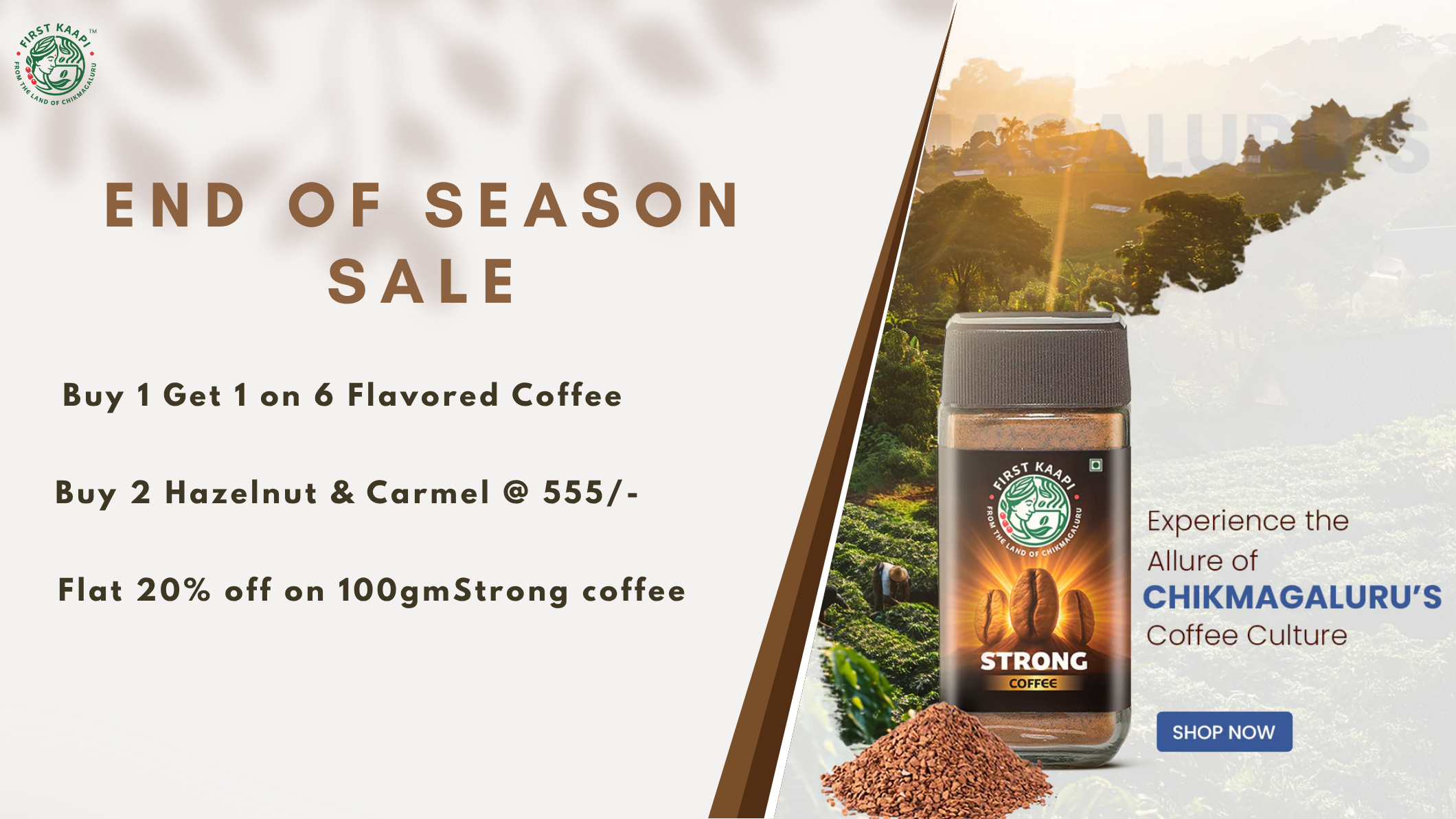 Buy 1 Get 1 on 6 Flavored Coffee | Buy 2 Hazelnut & Carmel @ 555/- | Flat 20% off on 100gmStrong coffee